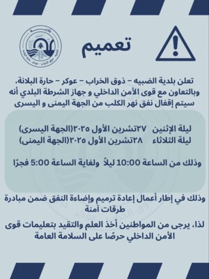 إجراءات ليلية ستؤثر على حركة المرور… التفاصيل لاحقاً… أعلنت بلدية الضبية- ذوق الخراب- عوكر- حارة البلانة، في بيان، أنّ “بالتعاون مع قوى الأمن الدّاخلي وجهاز الشّرطة البلدي، سيتمّ إقفال نفق نهر الكلب من الجهة اليمنى واليسرى: ليلة الإثنين 27 تشرين الأوّل 2025 (الجهة اليسرى)، وليلة الثّلثاء 28 تشرين الأوّل 2025 (الجهة اليمنى)، من السّاعة 10:00 ليلًا ولغاية السّاعة 5:00 فجرًا؛ وذلك في إطار أعمال إعادة ترميم وإضاءة النّفق ضمن مبادرة “طرقات آمنة”. وطلبت من المواطنين “أخذ العلم والتقيّد بتعليمات قوى الأمن الدّاخلي، حرصًا على السّلامة العامّة”.