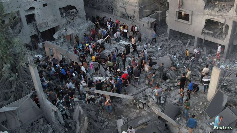 وقال ثلاثة مسؤولين إقليميين مطلعين على المناقشات بين الولايات المتحدة وزعماء الشرق الأوسط إن الاستراتيجية الإسرائيلية الفورية هي تدمير البنية التحتية في غزة، حتى لو سقط عدد كبير من الضحايا المدنيين، إلى جانب دفْع سكان القطاع نحو الحدود المصرية وملاحقة حـ.مـ.اس بتفجير شبكة الأنفاق مترامية الأطراف تحت الأرض والتي بنتها الجماعة لتنفيذ عملياتها.