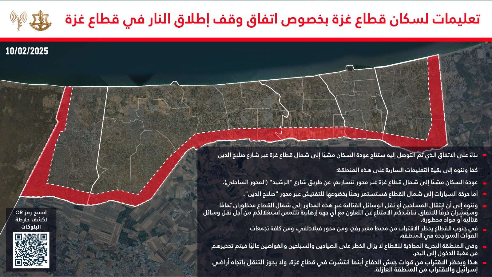 بناءً على الاتفاق الذي تم التوصل إليه وبعد استكمال استعدادات قوات جيش الدفاع تتاح عودة السكان مشيًا إلى شمال قطاع غزة عبر شارع صلاح الدين.
