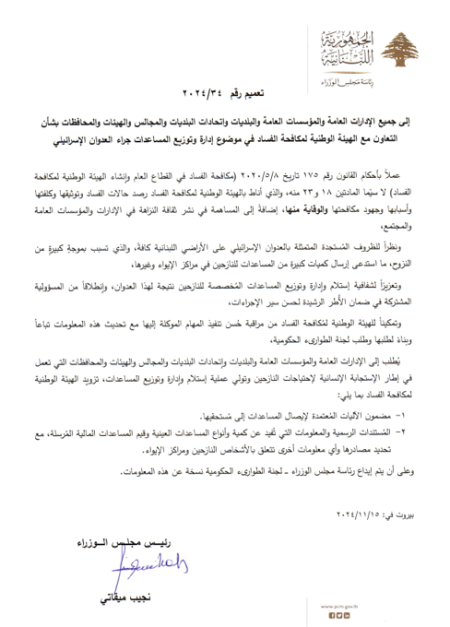 صدر عن مجلس الوزراء تعميماً بشأن التعاون مع الهيئة الوطنية لمكافحة الفساد في موضوع إدارة وتوزيع المساعدات.