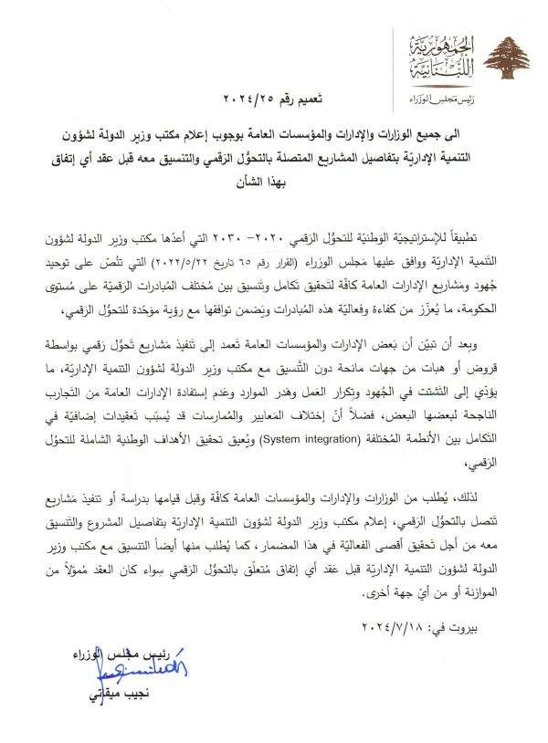 إلى “الوزارات والإدارات والمؤسسات العامة بوجوب إعلام مكتب وزير الدولة لشؤون التنمية الادارية بتفاصيل المشاريع المتصلة بالتحول الرقمي والتنسيق معه قبل