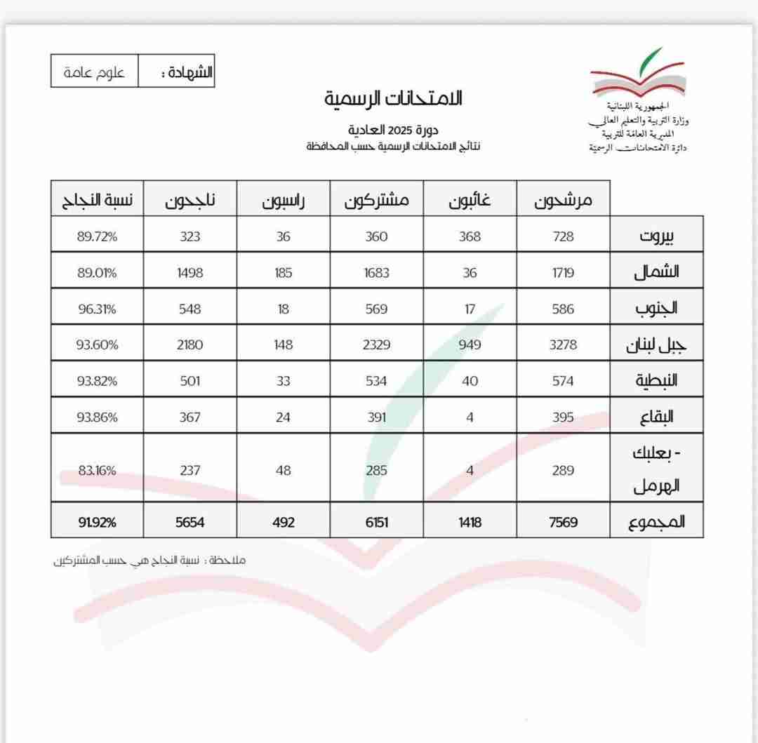 | الفرع | نسبة النجاح العامة | المدارس الرسمية | المدارس الخاصة |