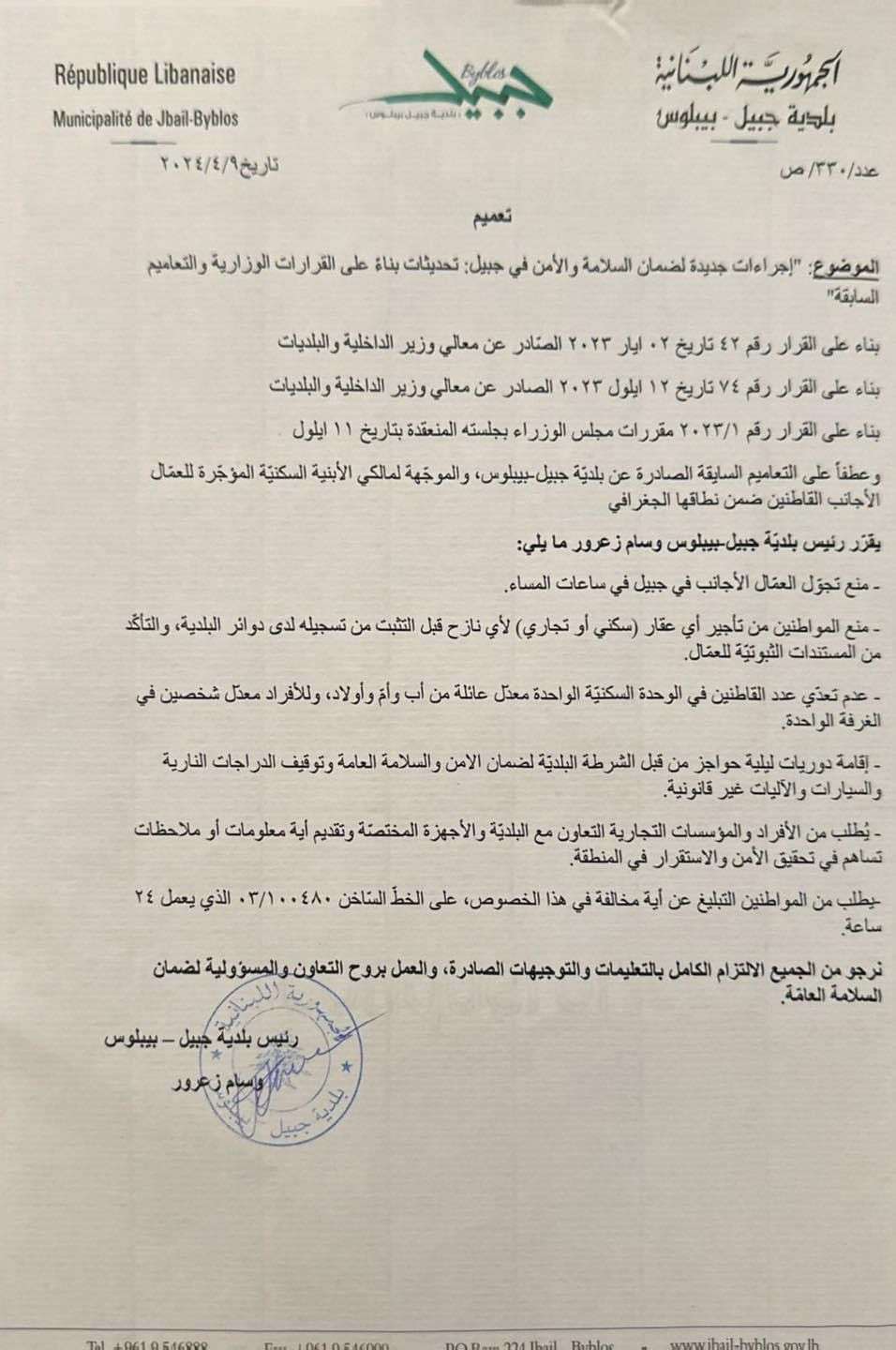 وكان قد صدر عن بلدية جبيل بيان جاء فيه: