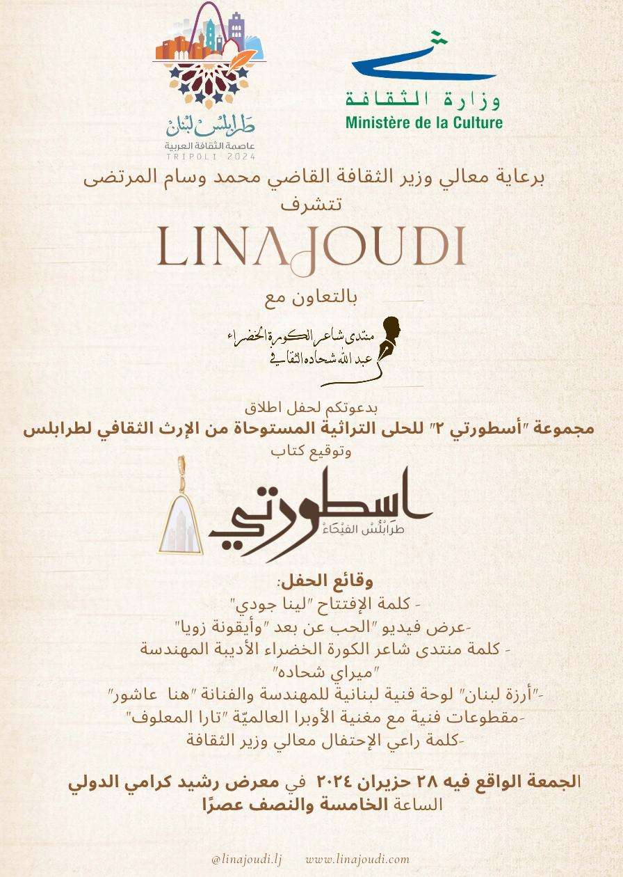 تحت رعاية معالي وزير الثقافة القاضي محمد وسام المرتضى، وبالتعاون مع منتدى شاعر الكورة الخضراء عبدالله شحادة. تطلق المصمّمة السيدة لينا جودي مجموعتها الثانية من الحلى التراثية المستوحاة من آثار مدينة طرابلس وشعار إعلانها مدينةً للثقافة العربية.