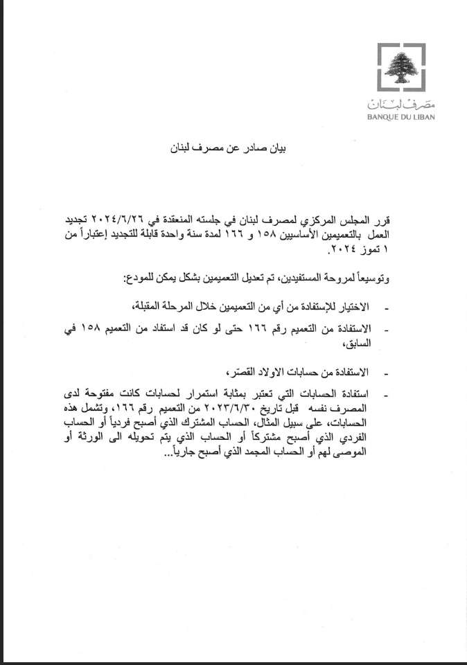قرر المجلس المركزي لمصرف لبنان تجديد العمل بالتعميمين الأساسيين 158 و166 لمدة سنة واحدة قابلة للتجديد اعتبارا من 1 تموز 2024.