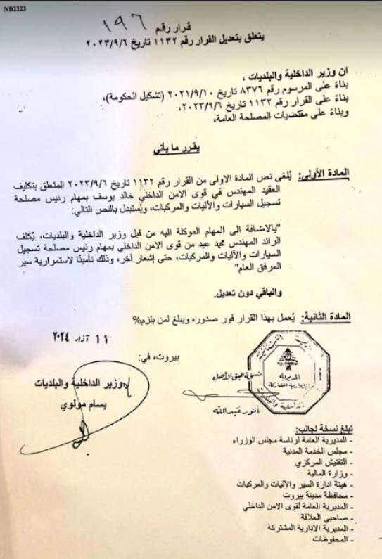 بالاضافة إلى المهام الموكلة اليه من قبل وزير الداخلية والبلديات، يُكلف الرائد المهندس محمد عيد من قوى الامن الداخلي بمهام رئيس مصلحة تسجيل السيارات والآليات والمركبات، حتى إشعار آخر، وذلك تأمينا لاستمرارية سير المرفق العام, والباقي دون تعديل”.