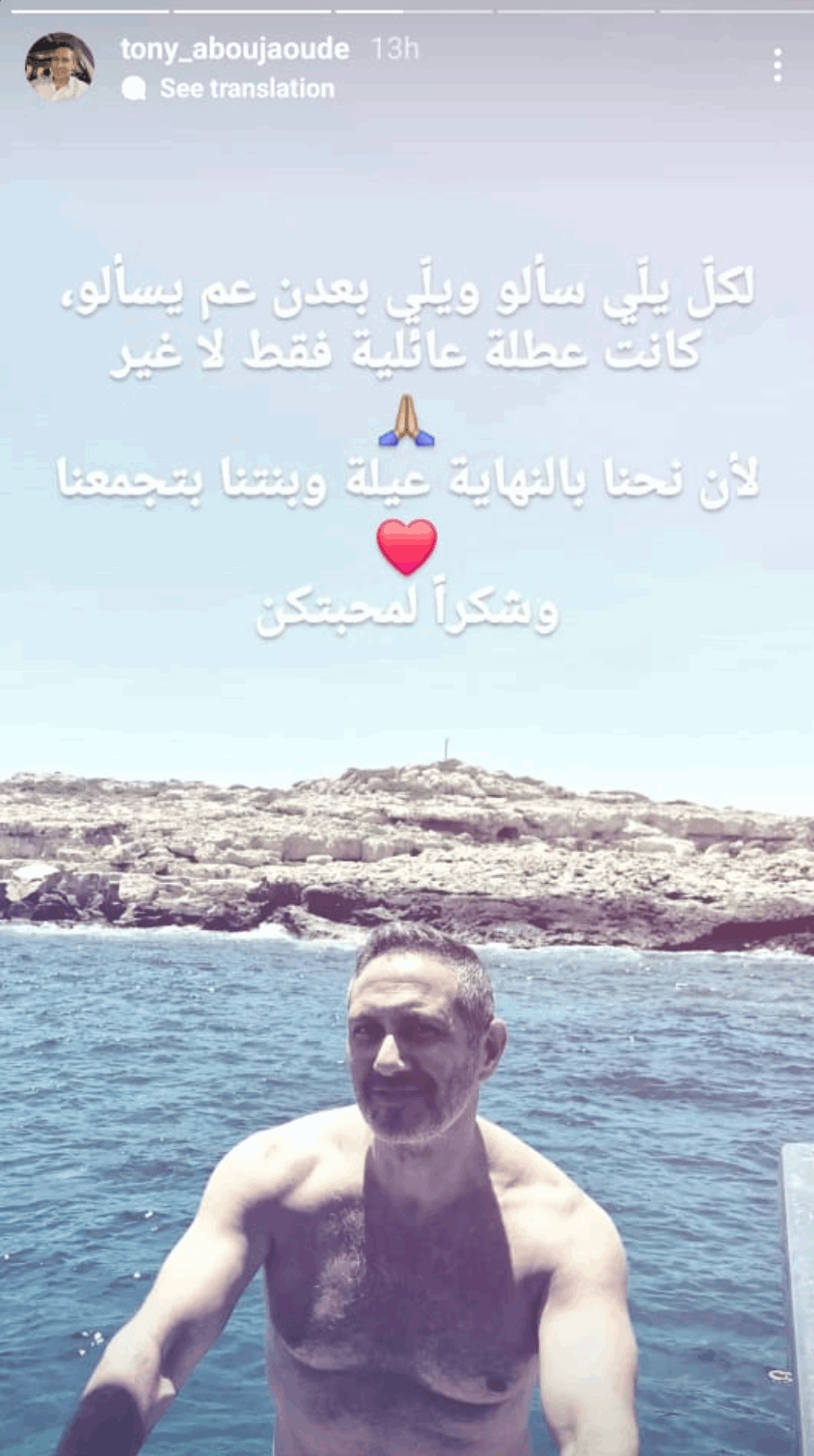 وفي هذا الإطار نشر الممثل طوني أبو جودة صورة له من إجازته في قبرص عبر خاصية “الستوري” على حسابه على انستغرام. وعلّق عليها قائلا: “لكل يلي سألو ويلي بعدن عم يسألو كانت عطلة عائلية فقط لا غير”.