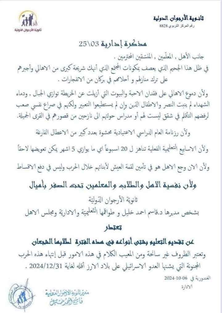 كما أن نفسية الأهل والطلاب والمعلمين تحت الصفر بأميال ثانوية الأرجوان الدولية بشخص مديرها د.قاسم احمد خليل وطواقمها التعليمية والإدارية ومجلس الأهل تعتذر عن تقديم التعليم بشتى أنواعه في هذه الفترة لطلابها الشجعان وتعتبر الظروف غير