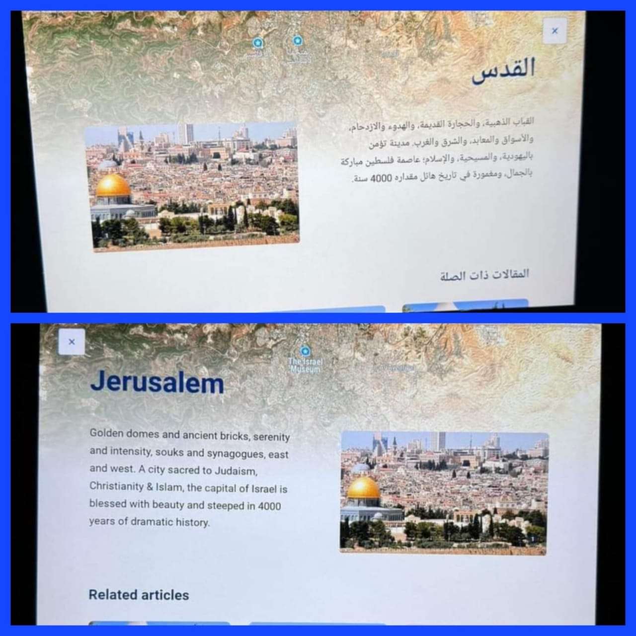 وذلك بحسب ما تداولت مواقع التواصل الاجتماعي ولا شك أنها تناست أن الغبار الذي يُغطي الحقيقة لا يلغيها فلسـ ـطين ولدت عربية وستبقى كذلك، شاء من شاء وابى من. ابى!! لكن السؤال الأبرز يبقى هل عبارة “القدس عاصمة إسـ ـرائيل” التي كتبت بالإنكليزية والتي ناقضت تلك العربية سقطت سهواً أم أنها كانت مقصودة لتلميع صورتهم أمام الغرب واستغفال العرب والإستخفاف بهم؟