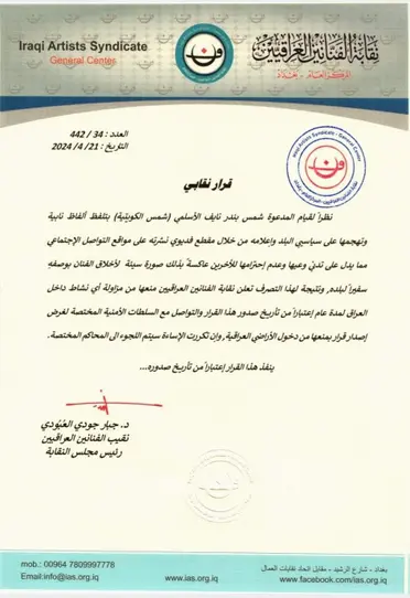 وذكرت أنّه “نتيجة لهذا التصرّف، تعلن نقابة الفنانين العراقيين منعها من مزاولة أي نشاط داخل العراق لمدّة عام اعتباراً من تاريخ صدور هذا القرار والتواصل مع السلطات الأمنية المختصّة لإصدار قرار بمنعها من دخول الأراضي العراقية”.