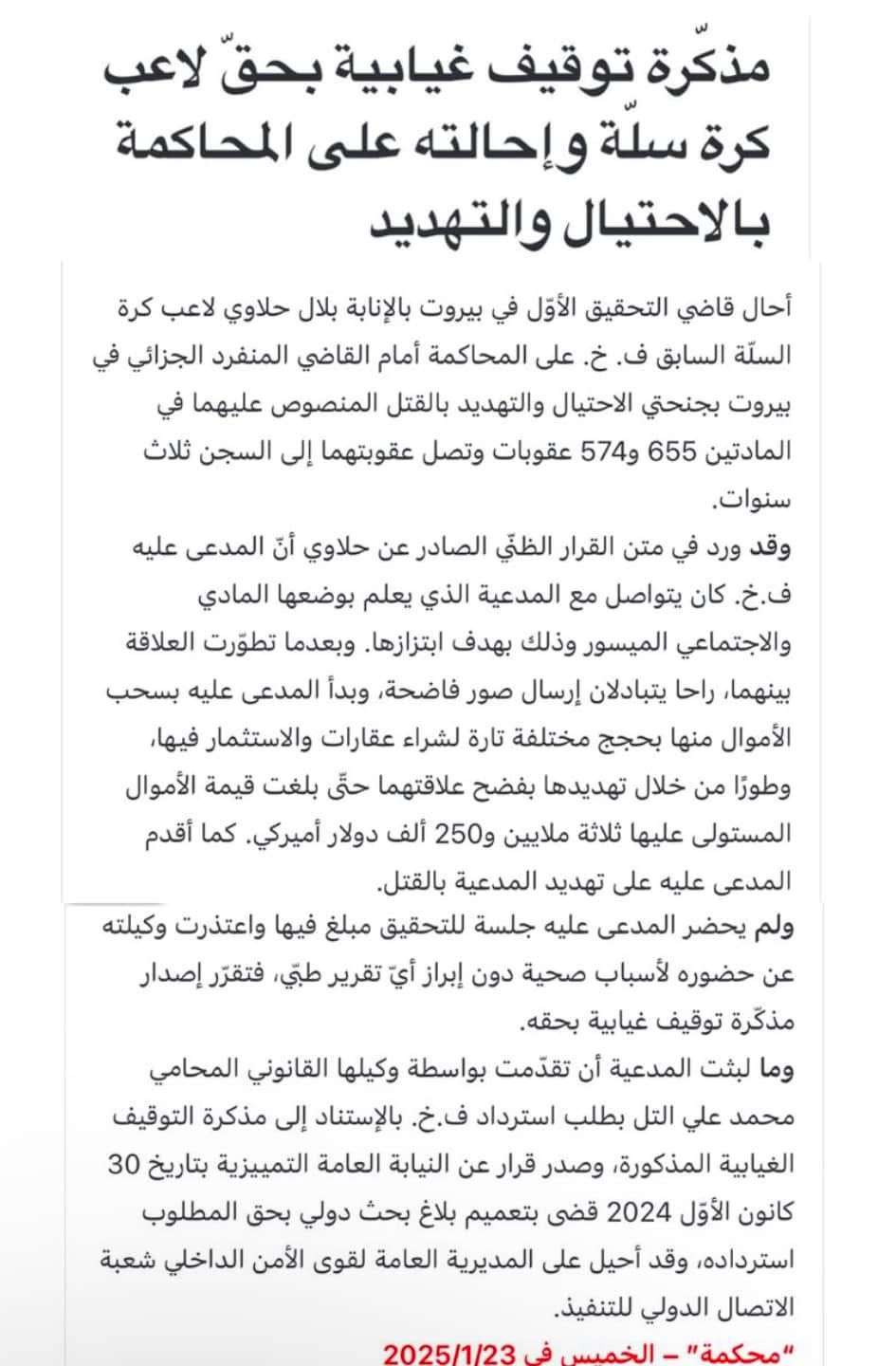 نجم كرة السلة اللبناني وأيقونة الرياضة فادي الخطيب يواجه اتهامات خطيرة تشمل الاحتـ ـيال، التـ ـهديد، والابتـ ـزاز. القضية بدأت عندما قدمت الضحية شكوى ضده، مدعية أنه هددها بنشر صور خاصة إذا لم تستثمر معه أو تدخل في شراكات عقارية. المبلغ المتورط فيه قد يصل إلى أكثر من ٣ مليون دولار