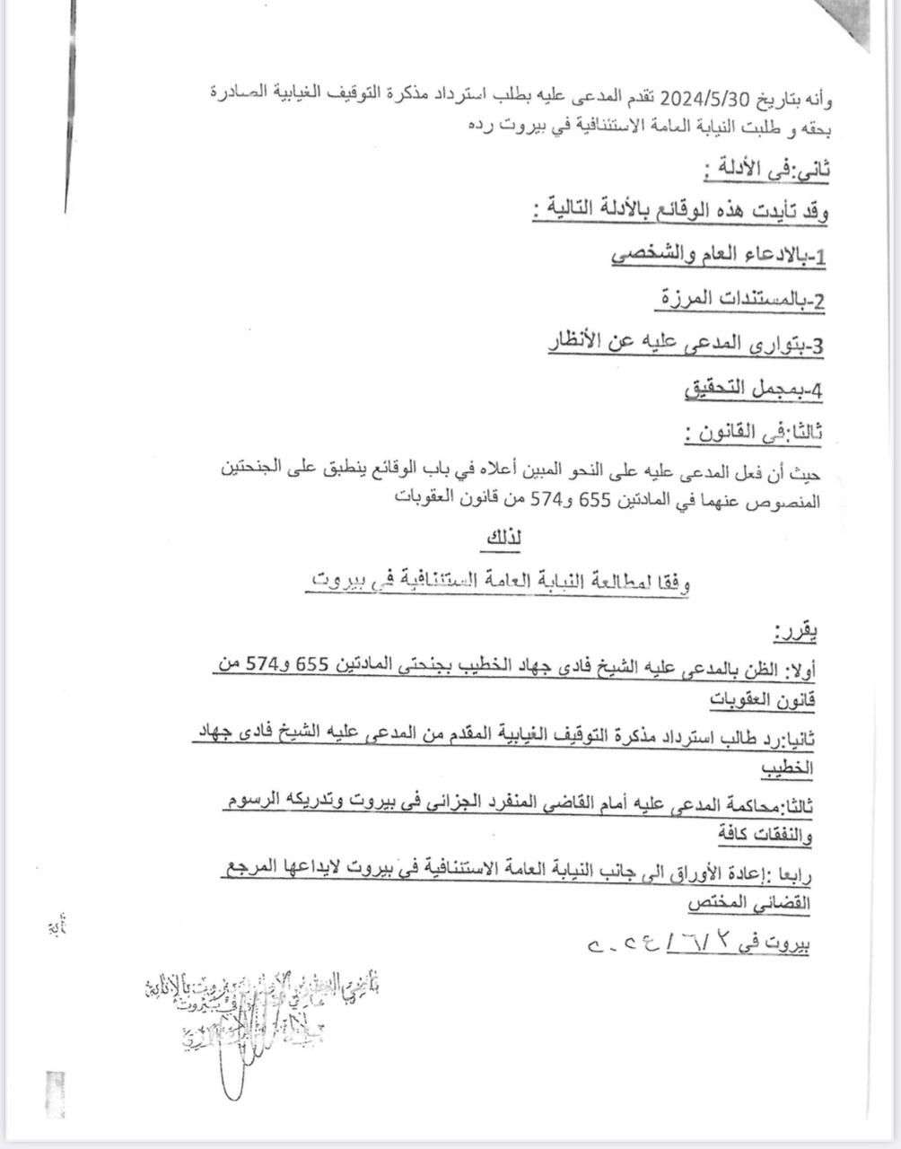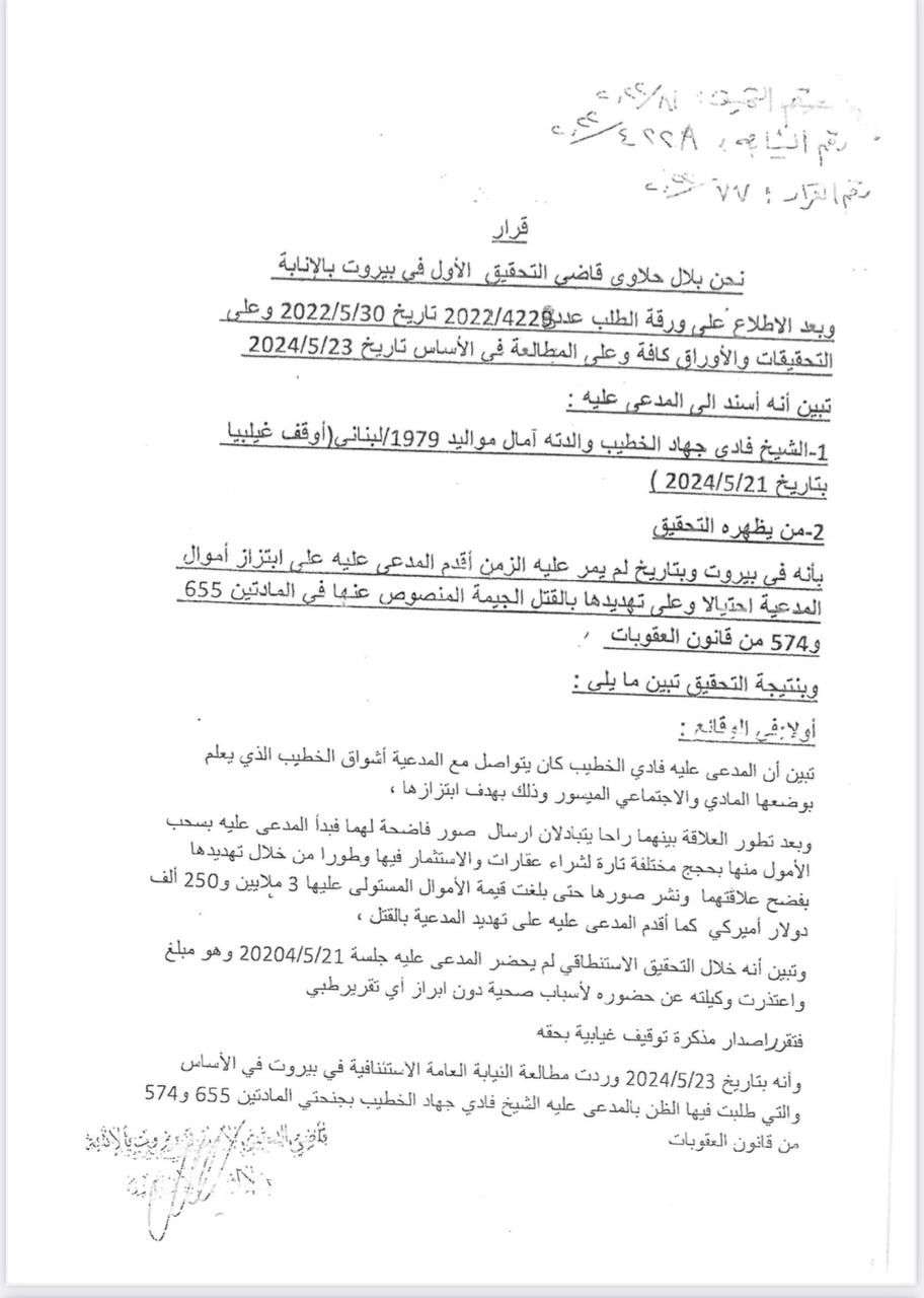 بدلاً من الامتثال للتحقيقات، تجاهل الخطيب الاستدعاءات، مما دفع قاضي التحقيق الأول في بيروت، بلال حلاوي، لإصدار مذكرة توقيف بحقه غيابياً. في 30 ديسمبر 2024، أصدرت النيابة العامة مذكرة دولية للبحث عنه واسترداده إلى لبنان