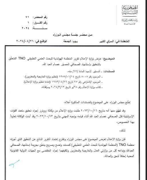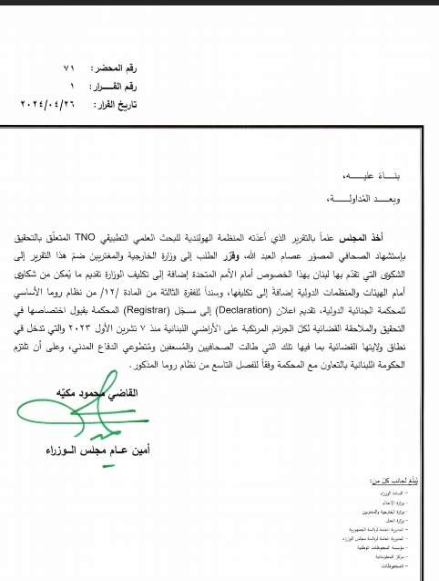 بعد اقتراح وزير الإعلام في حكومة تصريف الأعمال زياد المكاري باعتماد التقرير الصادر عن “المنظمة الهولندية للبحث العلمي”، حول استـ. ـشهاد الصحافي عصام عبدالله، كمستند رسمي تضمه وزارة الخارجية إلى الشكاوى المقدمة أمام المنظمات الدولية، قرّر مجلس الوزراء تبني الاقتراح رسمياً. بالإضافة إلى التقدم بطلب إلى المحكمة الجنائية الدولية بقبول اختصاصها في التحقيق بكافة الجرائم التي ارتكبت بحق الصحافيين، لمسعفي ومتطوعي الدفاع المدني من قبل إسـ ـرائيل.
