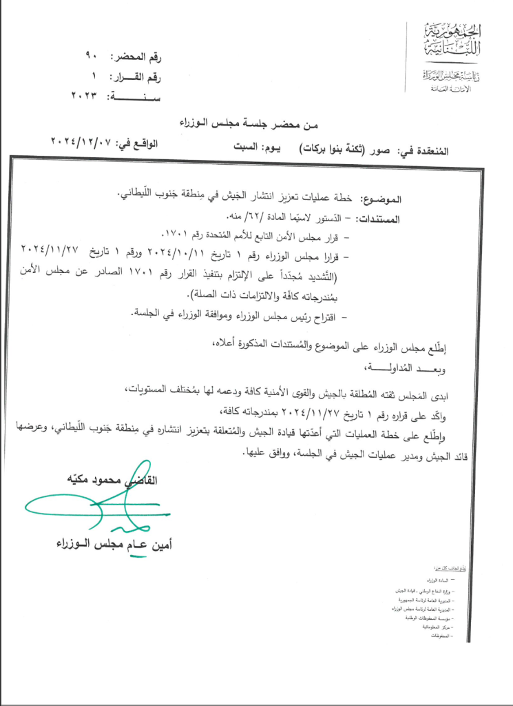 عقد مجلس الوزراء اجتماعا في “ثكنة بنوا بركات” في صور، أصدر على اثره سلسلة قرارات، تتعلق بخطة عمليات تعزيز انتشار الجيش، مشروع قانون يرمي الى اعادة الابنية المتهدمة، وآلية مسح الاضرار الزراعية، اضافة الى ترتيبات واجراءات تتعلق بعملية رفع الانقاض.
