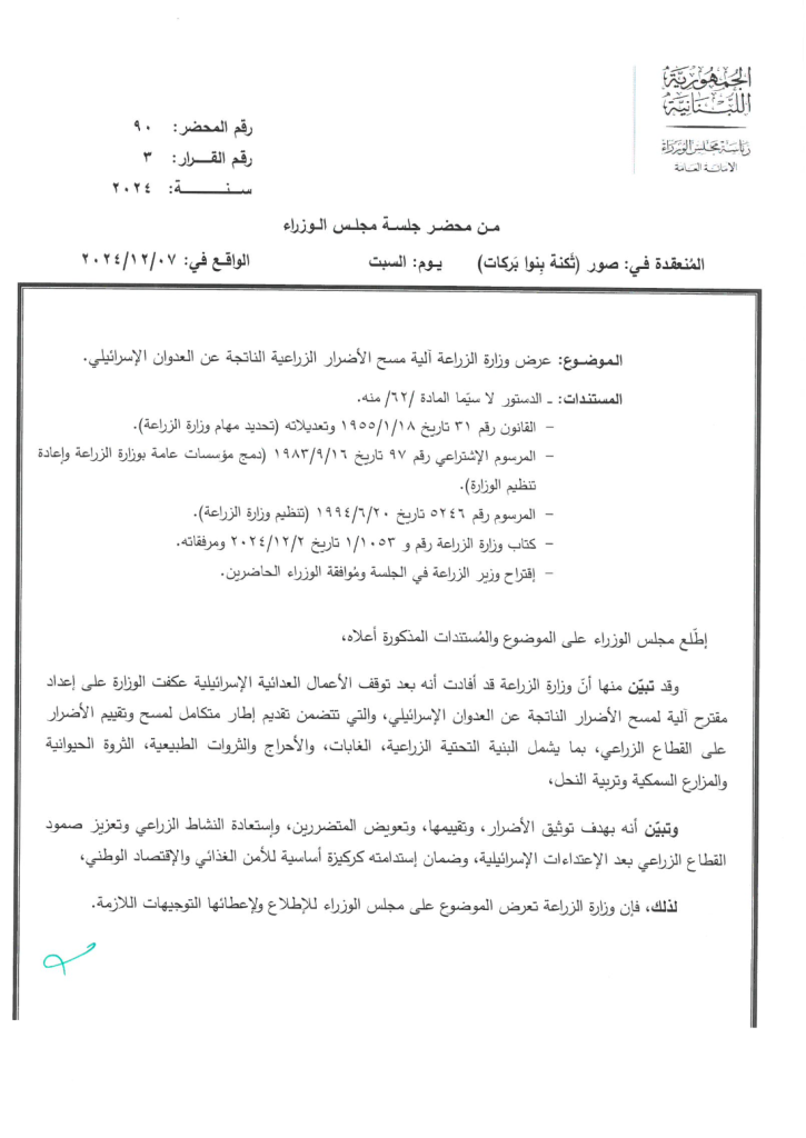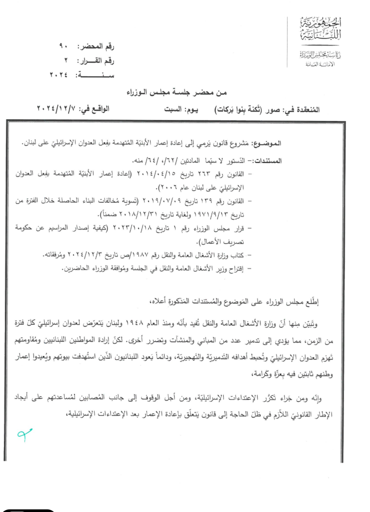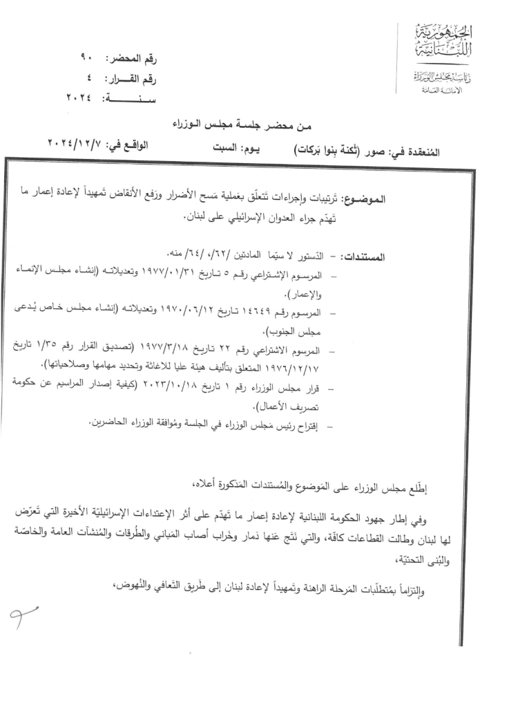 بينما تمّ البحث في الترتيبات والإجراءات المتعلقة بعملية مسح الأضرار ورفع الأنقاض لإعادة إعمار ما تهدّم جراء العـ ـدوان الإسـ ـرائيلي على لبنان.