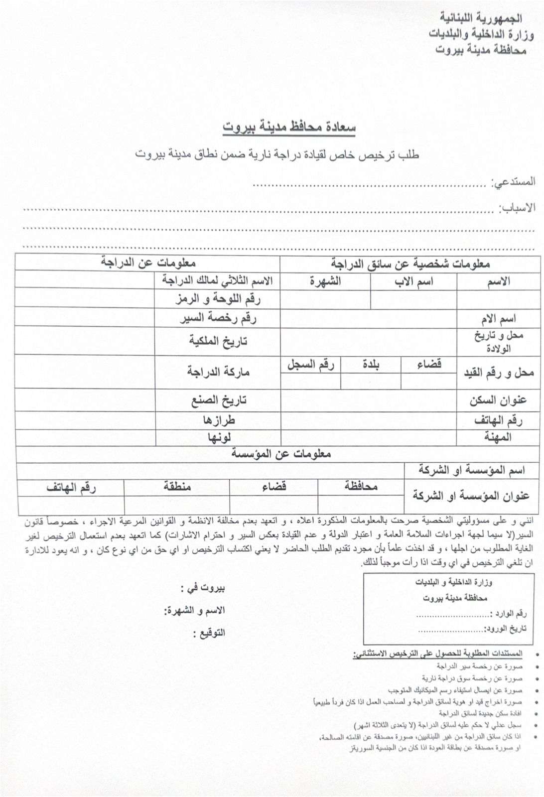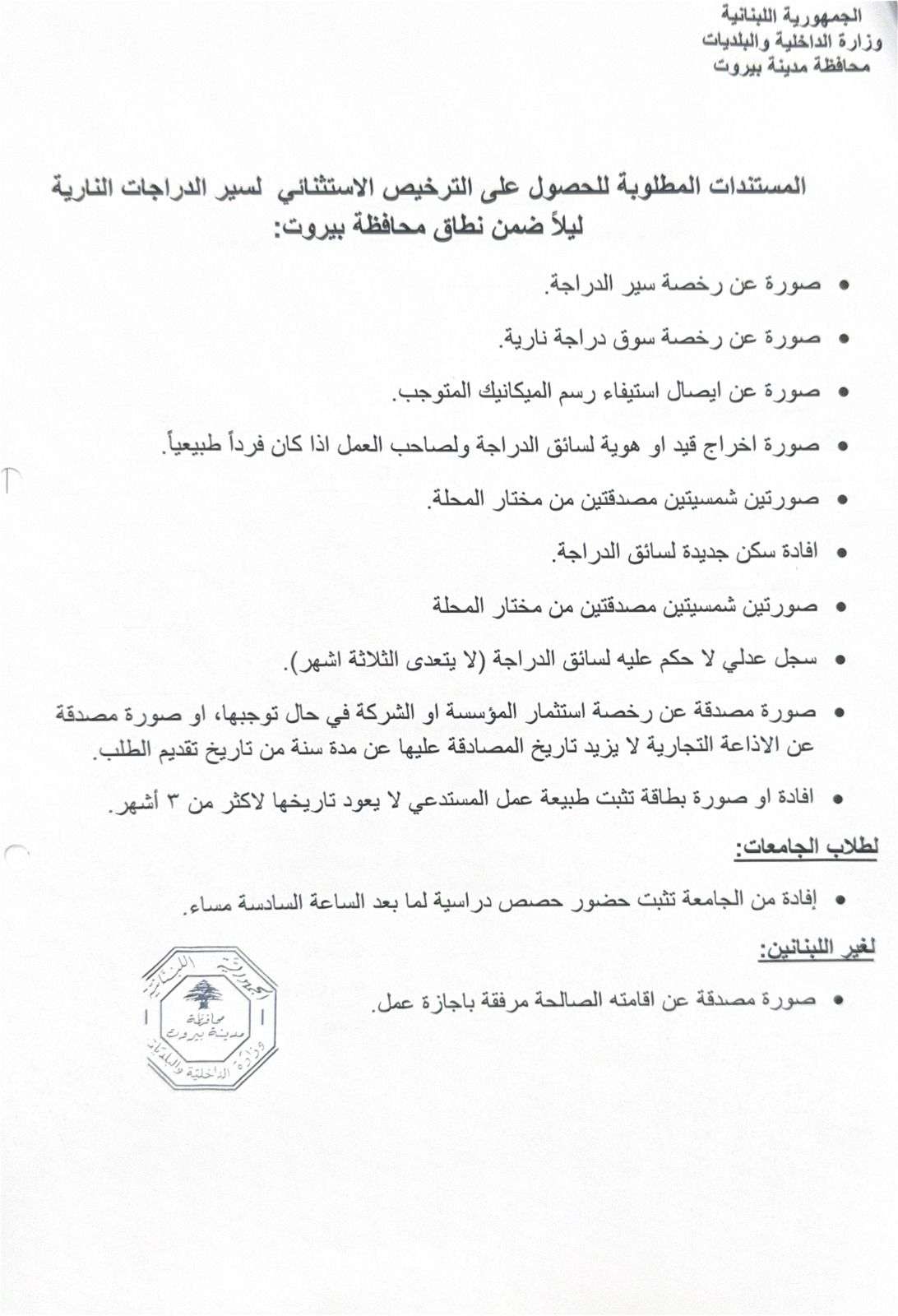 المادة الثالثة: على مالكي الدراجات النارية غير المستثنين من المنع بموجب المادة الثانية من هذا القرار والذين تفرض عليهم الضرورة القصوى التجول بدراجاتهم لما بعد الساعة 19:00 التقدم من دائرة المحافظة بطلب خطي مرفق به الأوراق الثبوتية القانونية له ولدراجته مع ذكر الأسباب القاهرة التي تفرض عليه التجول ليلاً ليصار الى دراسته وتحديد امكانية اعطائه ترخيص استثنائي للسير.