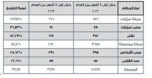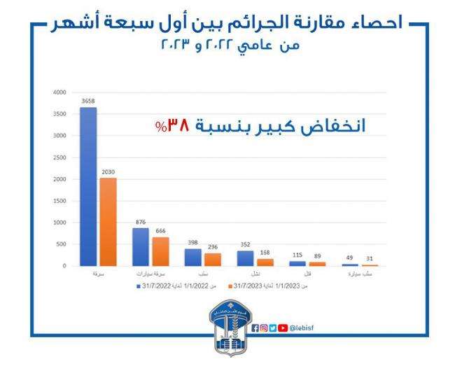 تُعمّم المديرية العامّة لقوى الأمن الدّاخلي جدولاً إحصائيّاً حول بعض الجرائم. الهامّة المُرتكبة خلال أول 7 أشهر من العام 2023. بحيث يوضح تراجعاً ملحوظاً مُقارنةً مع الأشهر ذاتها من العام المنصرم.