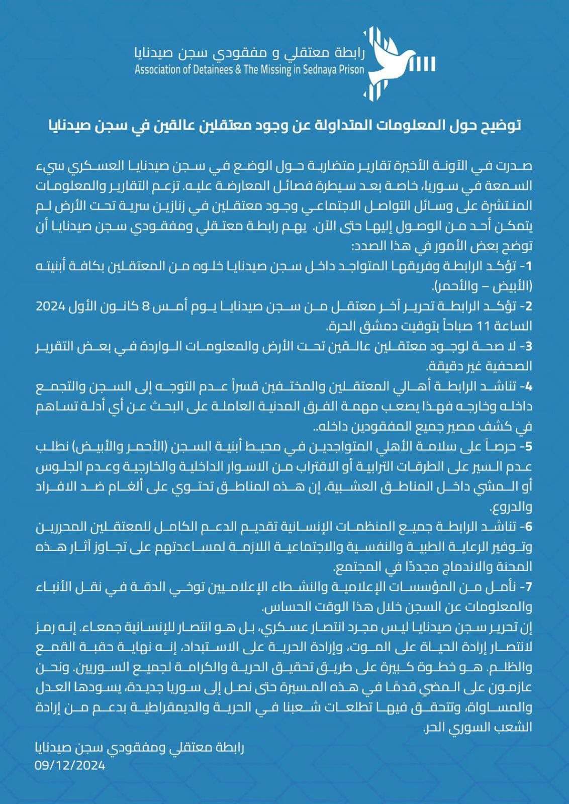 بعد إنتشار تقارير مضاربة حول الوضع في سجن صيدنايا العسكري سيء السمعة في سوريا، وبعد. سيطرة فصائل المعـ. ـارضة عليه أصدرت رابطة معتقلي ومفقودي سجن صيدنايا توضيحا حول المعلومات المتداولة