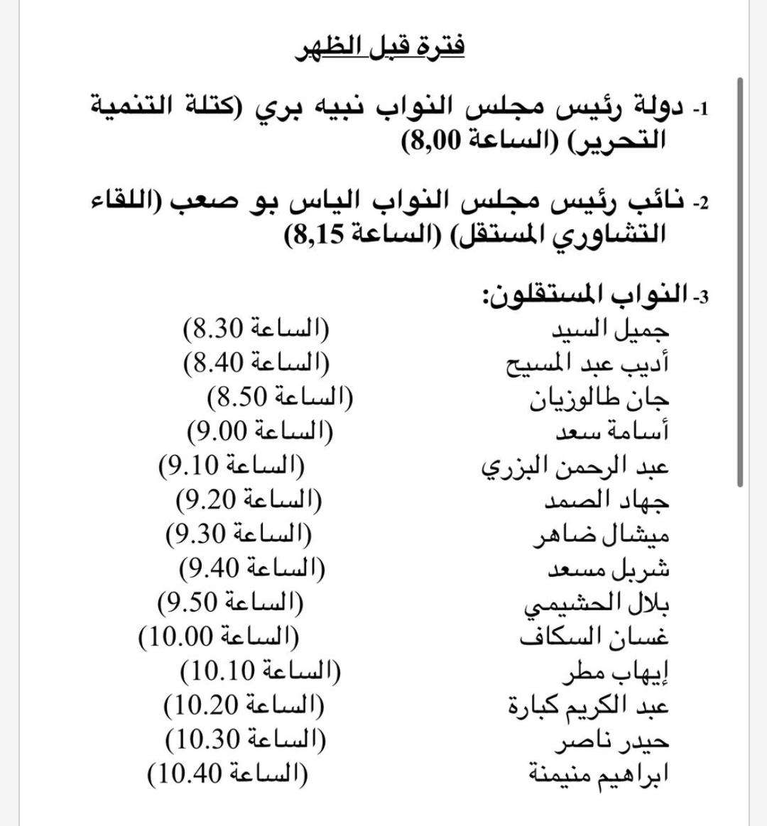 صدر عن المديرية العامة لرئاسة الجمهورية ما يلي, “عطفًا على احكام البنـد /2/ من المـادة /53/ من الدستور, يُجـري رئيس الجمهوريـة العماد جوزاف عون, الاستشارات النيابية لتسمية الرئيس المكلّف بتشكيـل الحكومة الجديدة, يوم الاثنين الواقع فيه 13/1/2025, في القصر الجمهوري في بعبـدا, وفق التالـي: