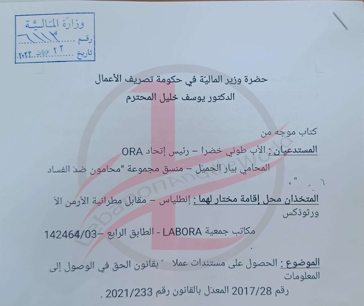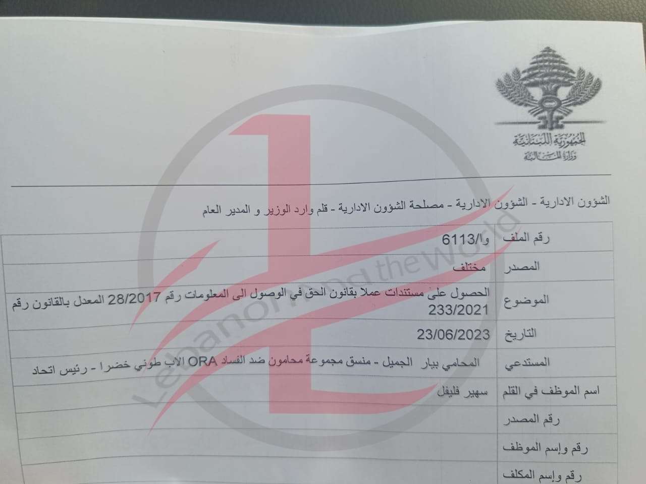 تقدم المحامي بيار الجميل والاب طوني خضره بطلب مشترك من وزير المال للحصول على نسخة عن تقرير شركة الفاريز فيما خص التدقيق بحسابات مصرف لبنان وقد تسجل الطلب بتاريخ 23/6/2023 تحت الرقم 6113/م