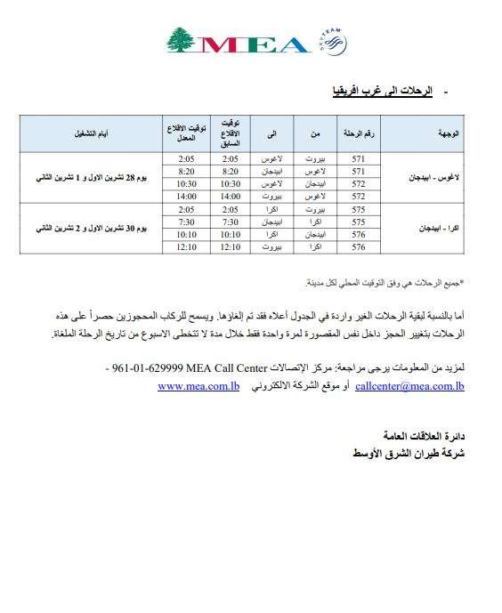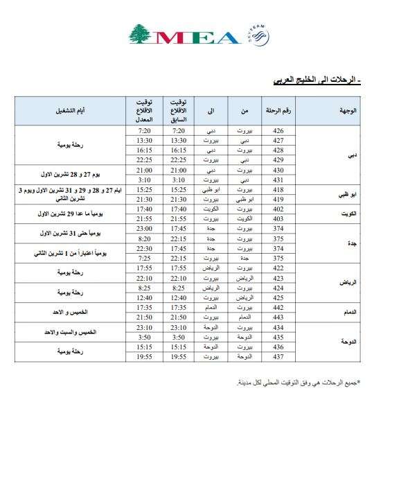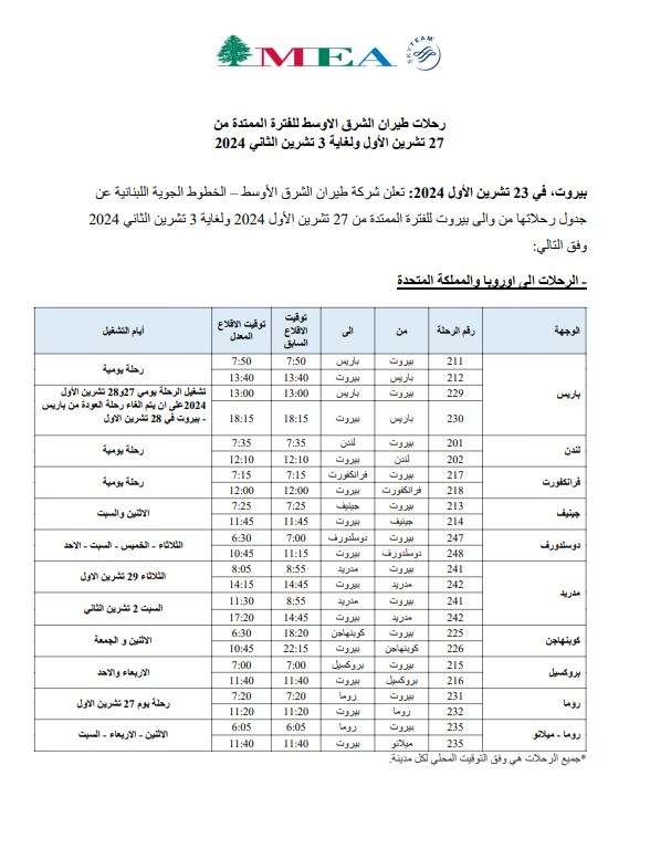 تعلن شركة طيران الشرق الأوسط – الخطوط الجوية اللبنانية عن جدول رحلاتها من والى بيروت للفترة الممتدة من 27 تشرين الأول 2024 ولغاية 3 تشرين الثاني 2024 وذلك وفق الصور المرفقة بالخبر.