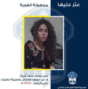 تُعمّم المديريّة العامّة لقوى الأمن الدّاخلي، بناءً على إشارة القضاء المختص، صورة سيّدة في العقد الثالث من العمر، موجودة في مخفر بعلبك في وحدة الدّرك الإقليمي، وهي لا تملك أوراقاً ثبوتية، ولم تُفصِح عن مكان إقامتها أو عن اسم أي شخصٍ من أقاربها، ويُرجّح أنّها تُعاني من اضطرابات نفسيّة.