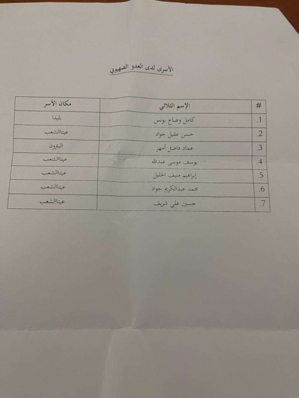 حصلت مصادر على اللائحة التي زود بها حـ ـزب الله السلطات اللبنانية والتي تضم أسماء ٧ أسـ ـرى وهم كامل يونس أسر في بليدا،حسن جواد، يوسف عبدالله، إبراهيم الخليل، محمد جواد، حسين شريف.