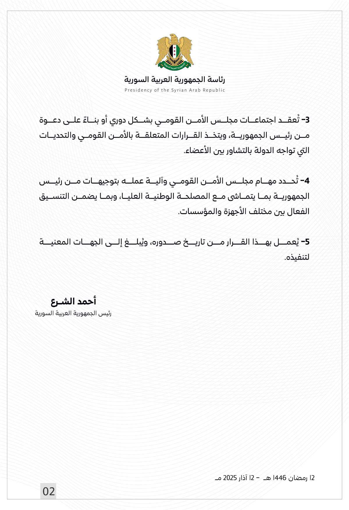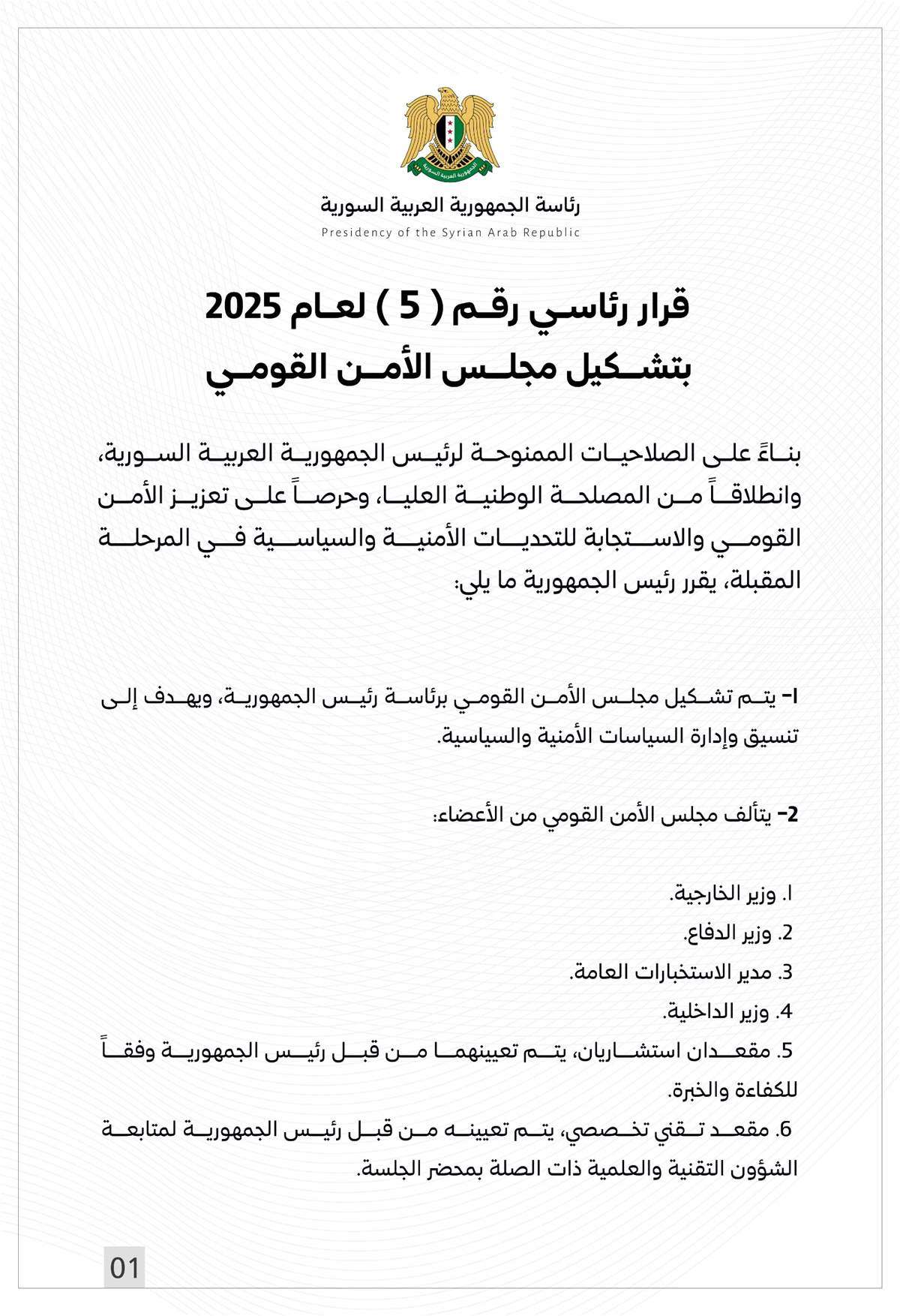 أصدر رئيس الجمهورية العربية السورية قرارًا بتشكيل مجلس الأمن القومي.
