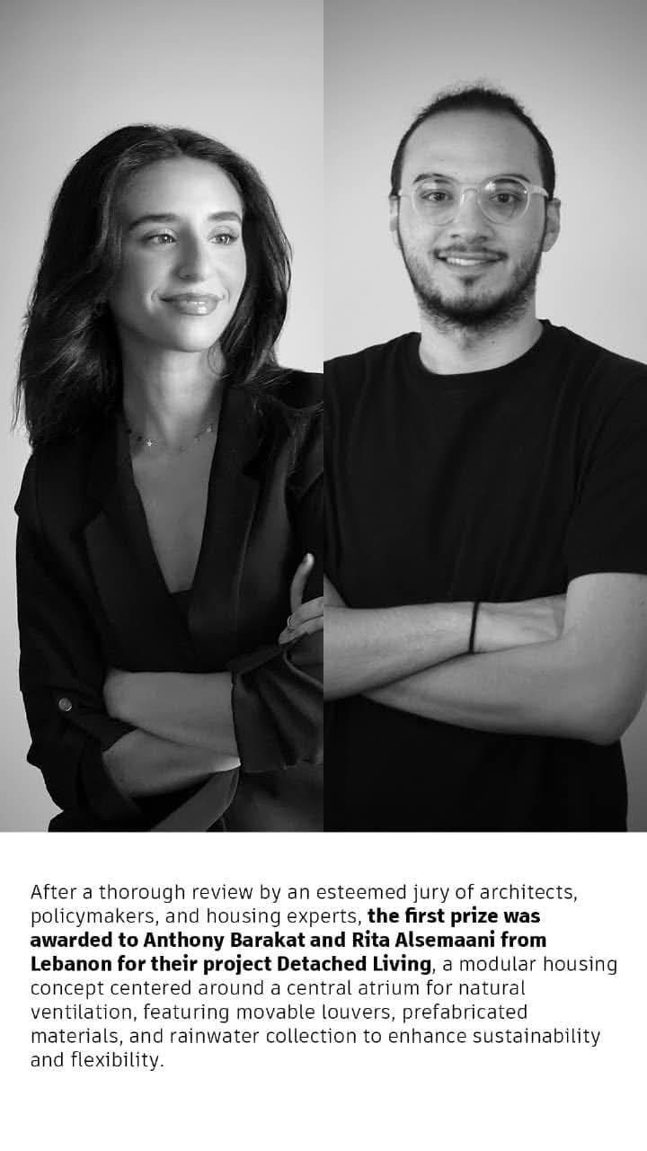 فاز خرّيجا كلّية الفنون الجميلة والعمارة في الجامعة اللبنانيّة في فرعها الثالث، المهندسة ريتا أنطوان السمعاني والمهندس أنطوني البرت بركات بالمركز الأوّل على مستوى العالم في مسابقة “تحدي الإسكان ذو الدرج الواحد” في دنفر، التي نظّمتها بيلدنر بالتعاون مع SIR والمهندسين المعماريين.