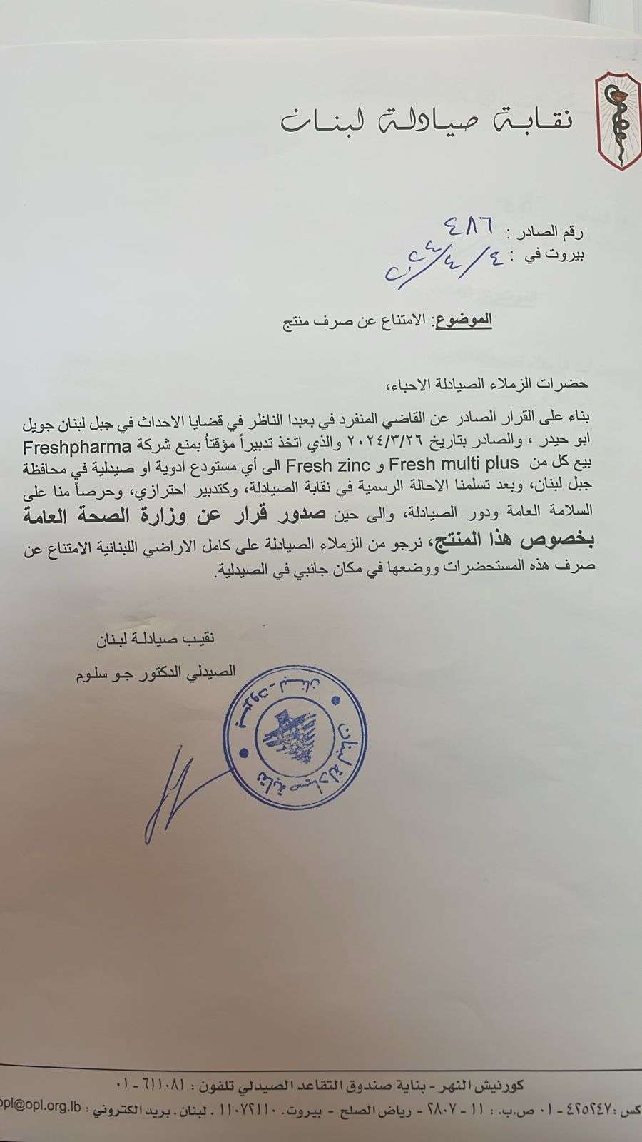 طالبت نقابة صيادلة لبنان الصيادلة بالامتناع عن صرف مستحضرات Fresh multi plus وFresh zinc المباعة من شركة Freshpharma ووضعها في مكان جانبي في الصيدليات إلى حين صدور قرار عن وزارة الصحة