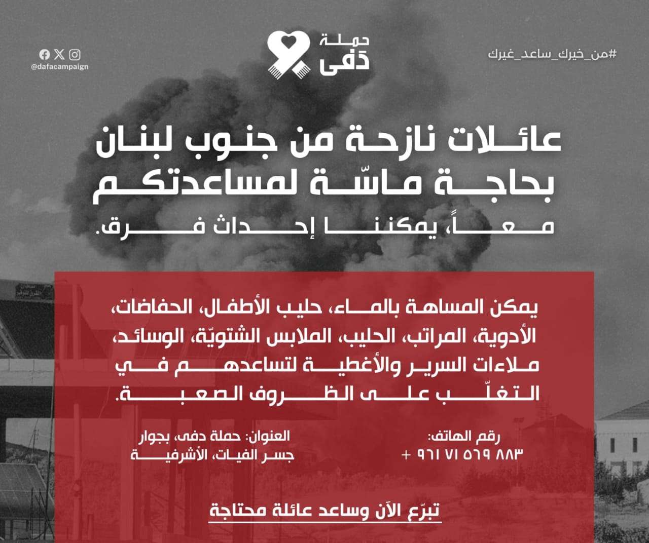 أطلقت حملة دفى حملة تبرعات لجمع المواد اللازمة لمساعدة العائلات النازحة من جنوب لبنان في هذه الظروف الصعبة