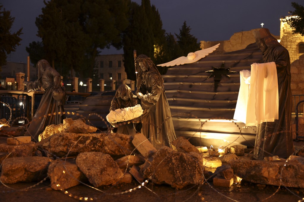 ولم توضع شجرة الميلاد الكبيرة مثلما جرت العادة في احتفالات عيد الميلاد ببيت لحم. ووُضِعت تماثيل المهد في الكنائس وسط أنقاض وأسلاك شائكة تضامناُ مع سكان غـ.ـزة.